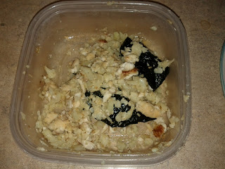 I took a bag of frozen cauliflower, cooked it in the microwave for about 5 minutes in a little water. Pulsed it a few times in my food processor until the cauliflower had the texture of rice. Added the cauli-rice to a pan & browned it up a little.